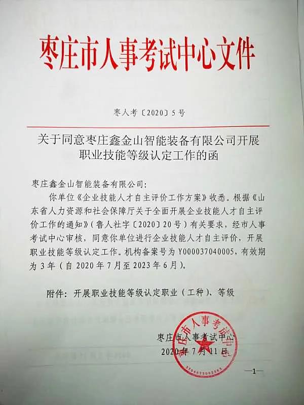 經(jīng)過評估審核,于今年7月中旬成功得到市人事考試中心的正式批復(fù),同意鑫金山進行企業(yè)技能人才自主評價,開展職業(yè)技能等級認(rèn)定的工作。并取得自主開展車工、銑工、鏜工、沖壓工、鉗工、電工等8個職業(yè)(工種),5個等級的職業(yè)技能等級認(rèn)定資質(zhì)。